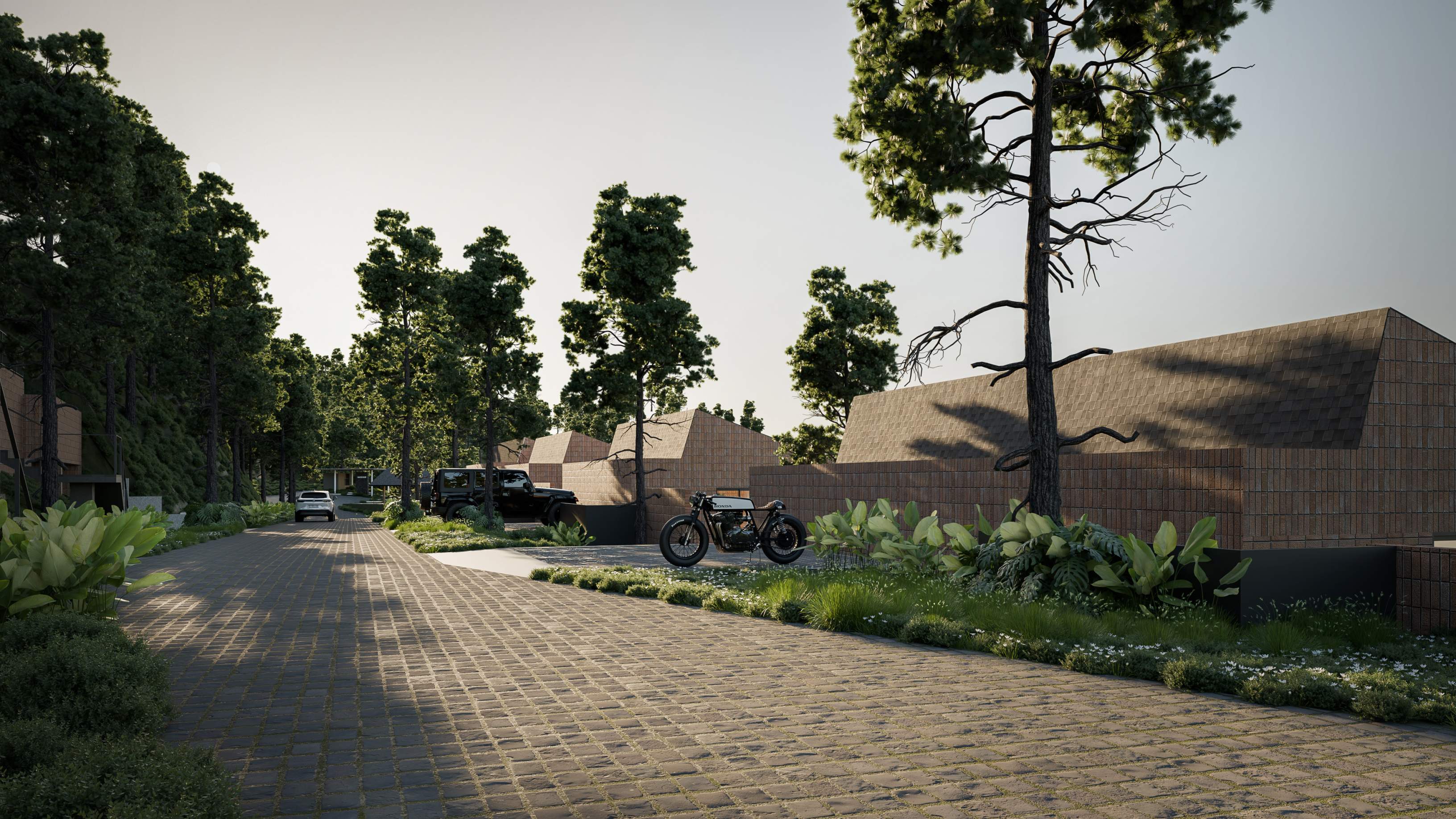 Hunian Kontemporer yang dibangun di atas lahan Downslope sangat cocok untuk anda yang ingin memiliki privasi ekstra namun tetap mendapat view pemandangan yang maksimal. Material Terracotta yang diekspos memberikan kesan hangat pada suasana dataran tinggi kota Bandung yang sejuk dan asri