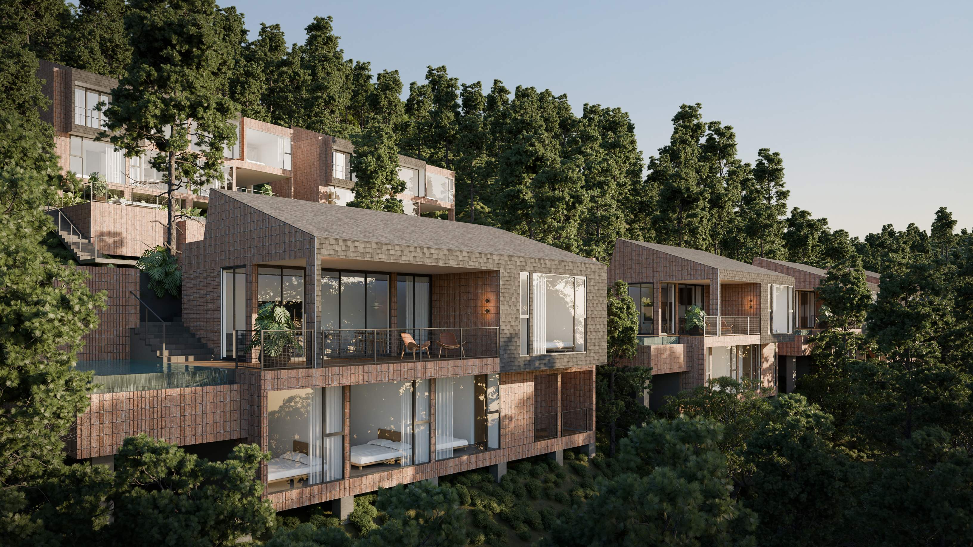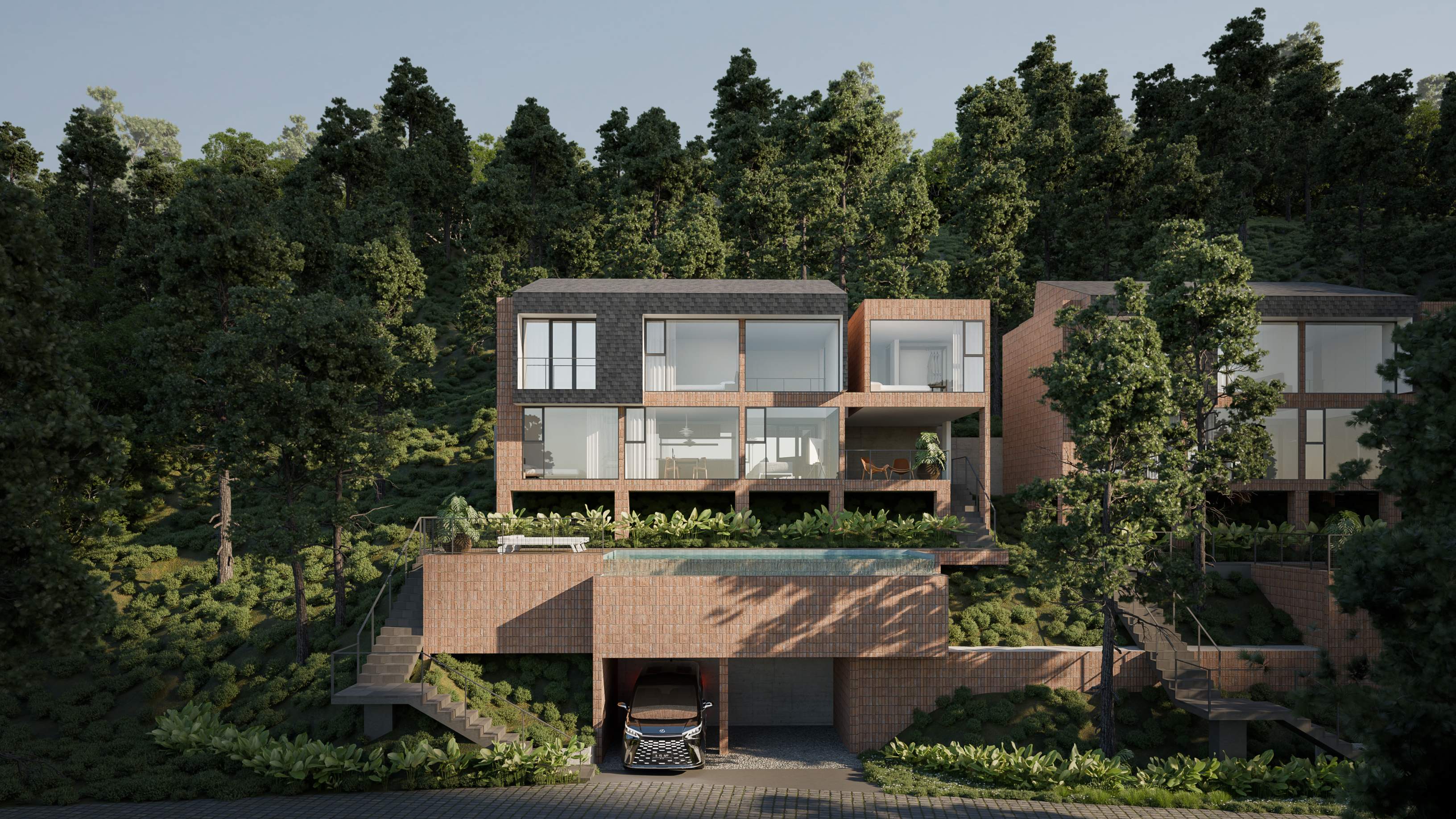 Hunian Kontemporer yang dibangun di atas lahan Downslope sangat cocok untuk anda yang ingin memiliki privasi ekstra namun tetap mendapat view pemandangan yang maksimal.